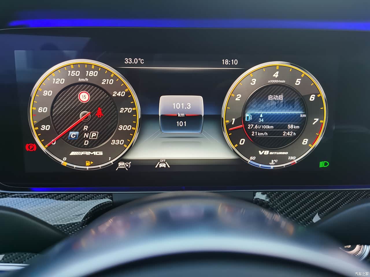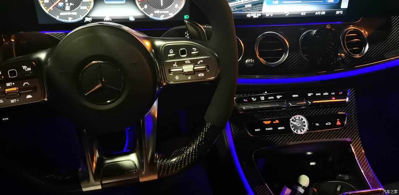 氛围灯,大面积碳纤维内饰。大连屏iwc表,奔驰的内饰要能挑出点什么毛病,那可能就不是奔驰了。 但是车机系统还是有点反应迟钝,卡卡的。