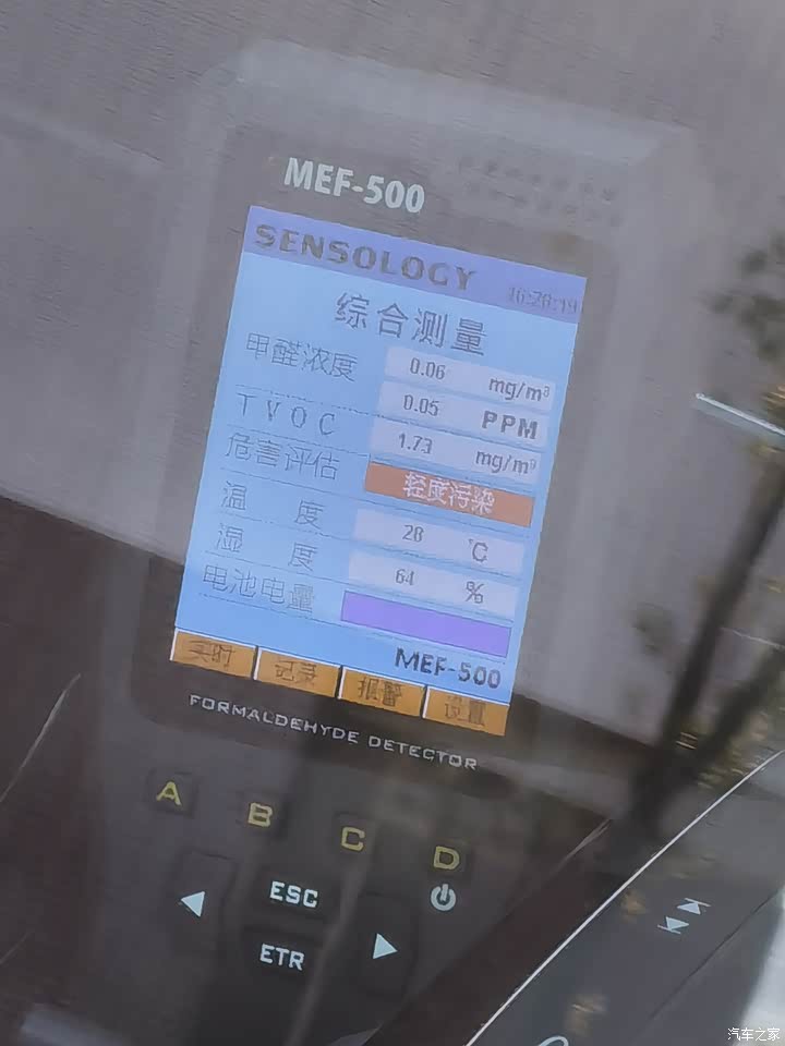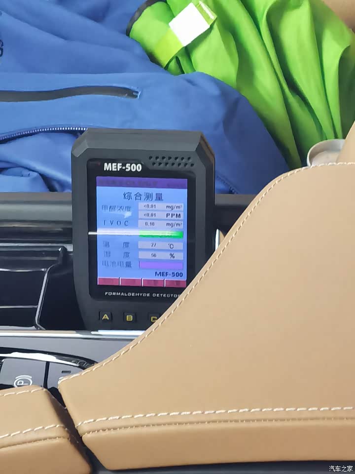 某天洗车后无聊拿一个MEF500 甲醛测试仪测试了一下车内空气质量,车辆均关闭车窗,在地面停放一小时,当日天气晴,测试时长约5-10分钟,以连续两分钟读数不增长为准。可以看到GLB空气质量为轻度污染,其中甲醛浓度0.06(国标0.1),TVOC挥发性有机化合物浓度1.73(国标0.6)比较高,属于轻度污染,还是要加强通风,车辆购入后只采用通风暴晒这种除味方式。 作为对比,一直以来以安全闻名的沃尔沃,室内空气质量良好,甲醛浓度小于0.01,TVOC浓度0.21。
