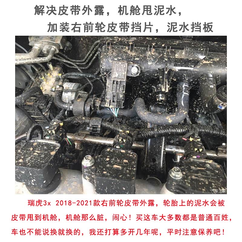 解决瑞虎3X/3XP皮带外露,机舱甩泥水,这是从风云2遗传下来的毛病。这个问题厂家一直没有改进,现在终于有了完美的解决方案,可以在右前轮拱处加装挡片,封住缺口。加装后不再有泥水被皮带甩到机舱,效果非常不错。为造福3X车友,把这个挡片加装过程分享出来,供车主们共同探讨。 先准备材料,右前轮皮带挡片马云家X宝有定制,挺便宜,耐高温PP片材;使用工具:10号小扳手和十字螺丝刀。