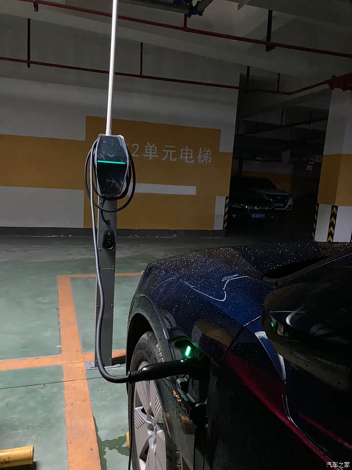 第一张图片是第一次用家用7kw充电桩充电,充满后显示的里程数(没有打开空调的情况下),相当于470的92折。第二张图片是家用充电桩(安装了一个立柱)。第三张图是充电的时候拍的。