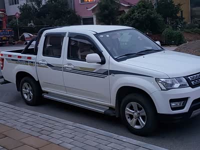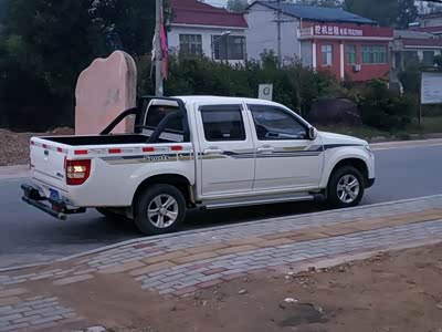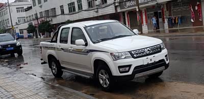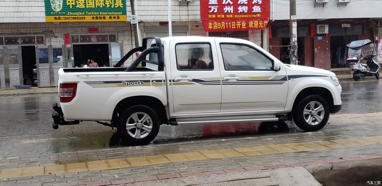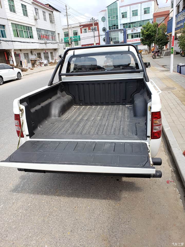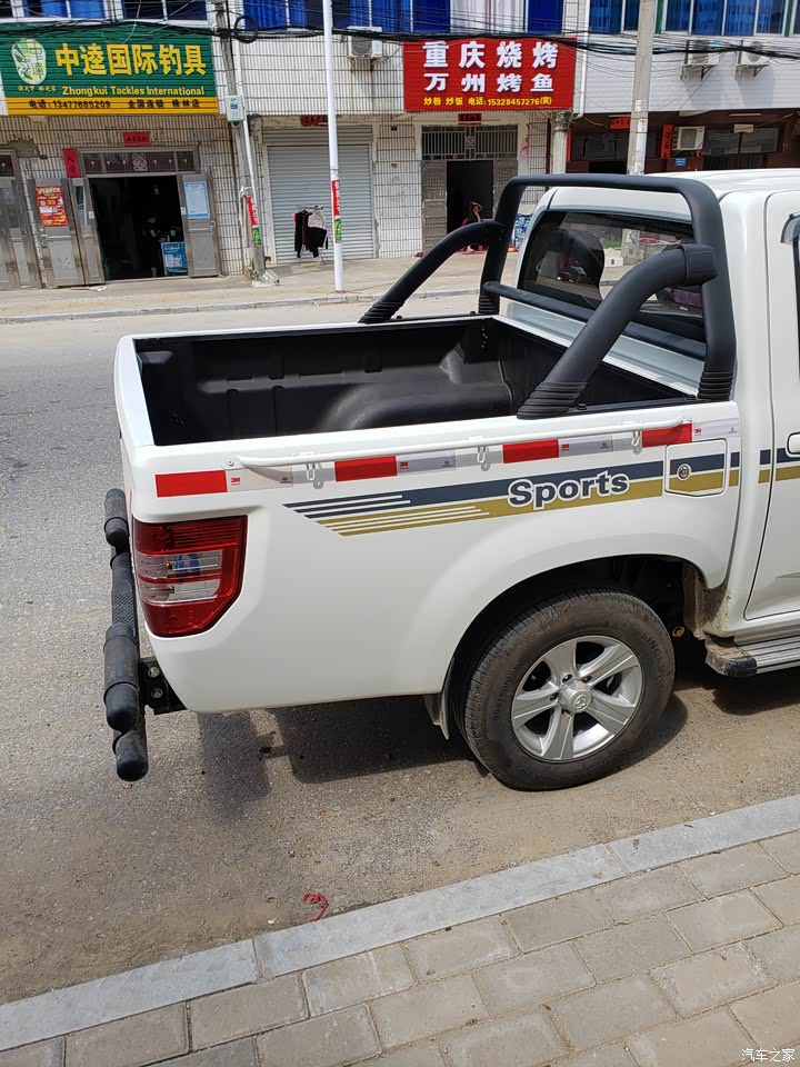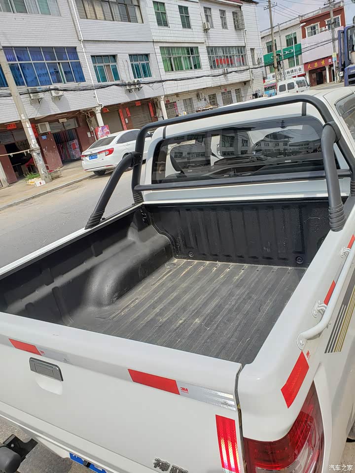 车子外观很大气,拉风,从不同角度看都很顺眼。购买车是没有样车,是在汽车之家看的图片,觉得挺好看的,价格也不贵,性价比比较高,决定购买他。原车带侧踏板,后保险杠,车身贴花,后期不用加装,皮卡行车证上叫轻型多用途货车,是属于货车范畴,每年需要年审,加装年审不好过关。这个点个赞!车厢长度1500*1415*480,后墙板放平有2050cm,还是能拉些货物的,车轮子也不大,货箱鼓起来的比其他皮卡要小些。货箱有原车货箱宝,这个点个赞,不需要增加保护货箱的东西。货箱有保护架子,这个绑货物很方便,有保护架车子显得很大气,整体效果很好。车身比例比较协调。轴距3025mm,比一般的皮卡轴距短些(长箱版轴距3470厘米,长城轴距3350厘米),转弯掉头方便些,车身1720厘米,比一般皮卡要窄些(长城1800cm)。整车长度5080(含后保险杆,不带保险杠的4980cm),在农村路上行驶还可以,当然比面拖要长,要宽。车子离地间隙还是比较高的,通过性很好。
