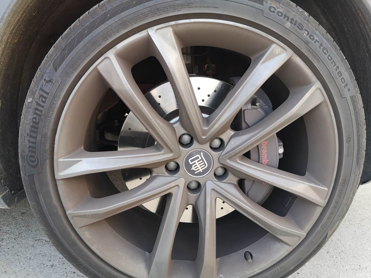 22寸轮毂采用布雷博打孔通风式刹车卡钳,立马让这款车上了档次。胎是好胎就是在路况差的地方行驶有点废胎。