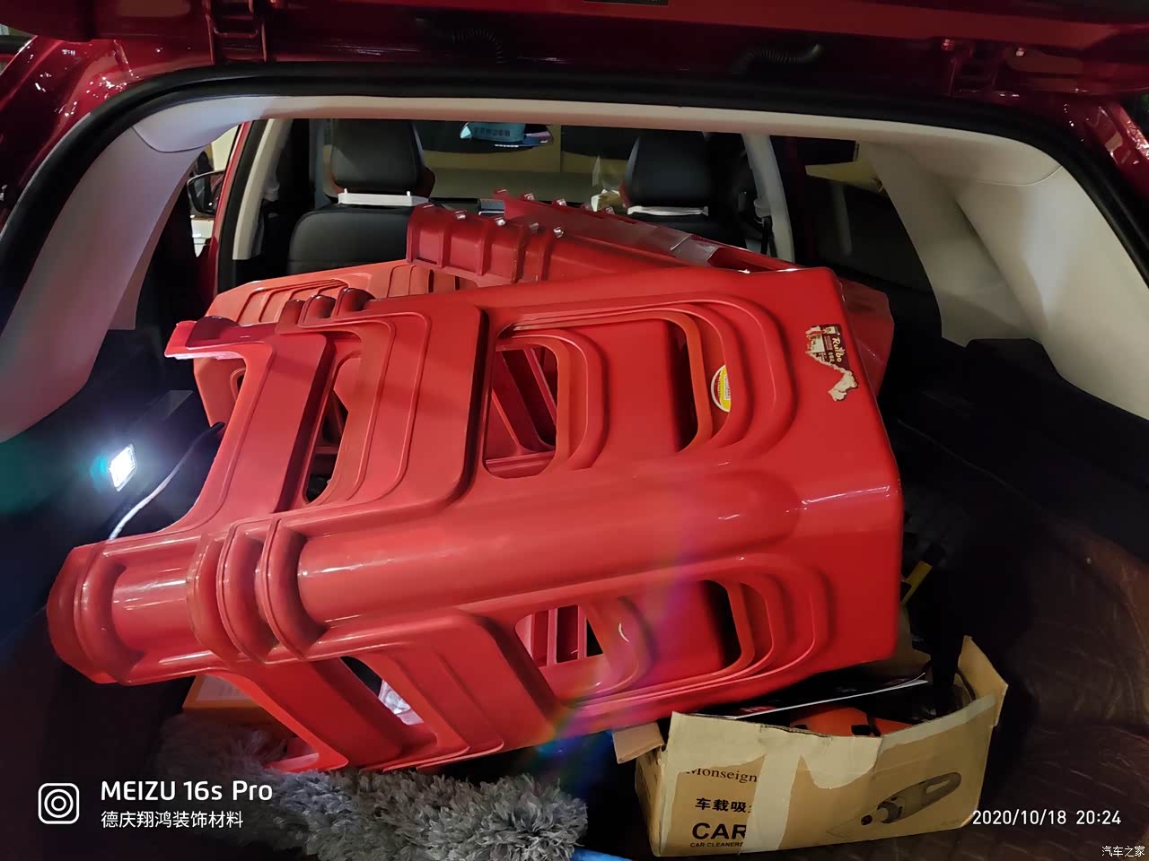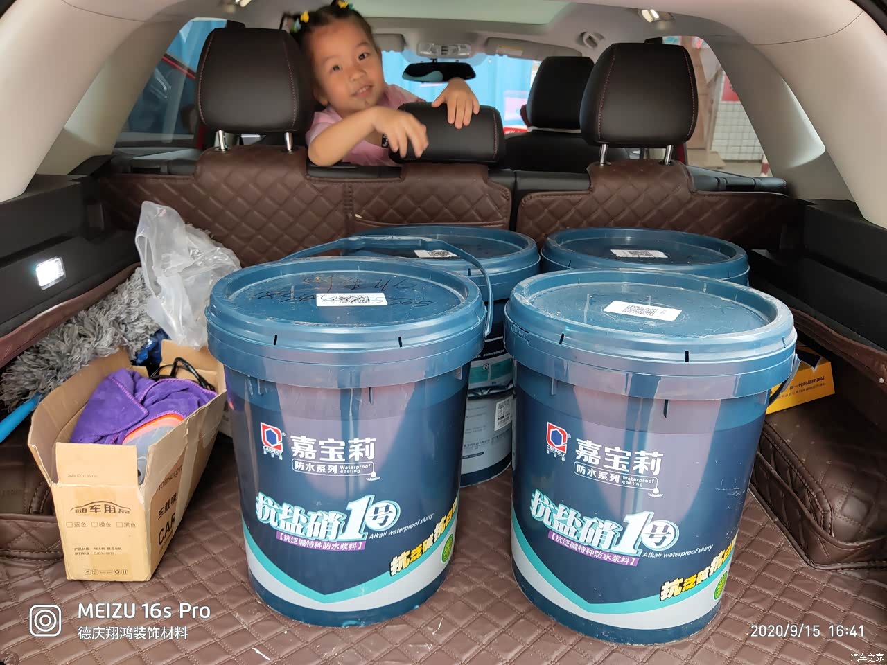 后备箱能放6桶大桶的乳胶漆,放倒之后能放几十张塑料凳