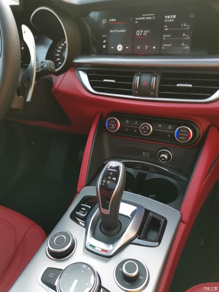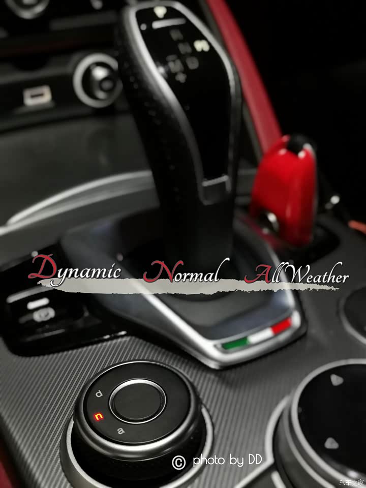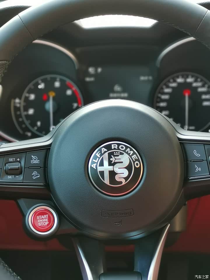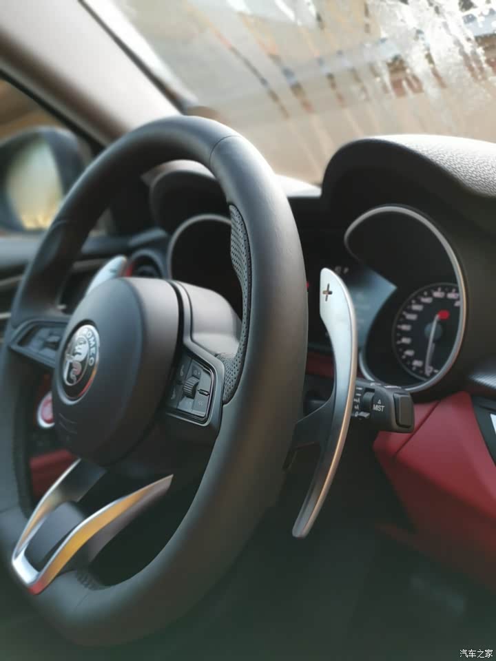 干净时尚的意大利内饰设计,方向盘的红色启动按钮真香,原创换挡拨片,同时拨动为空挡,单独拨动升档可进去前进档