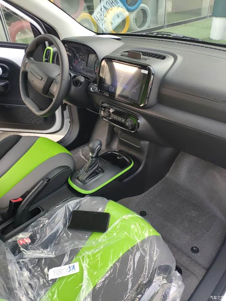 内室简单实用,有个手机支架方便手机导航,绿色的空调出风口点缀的中控台很清新,小巧可爱的门内拉手既可爱又方便,手刹后边还有个隐藏起来的点烟器接头方便给手机充电