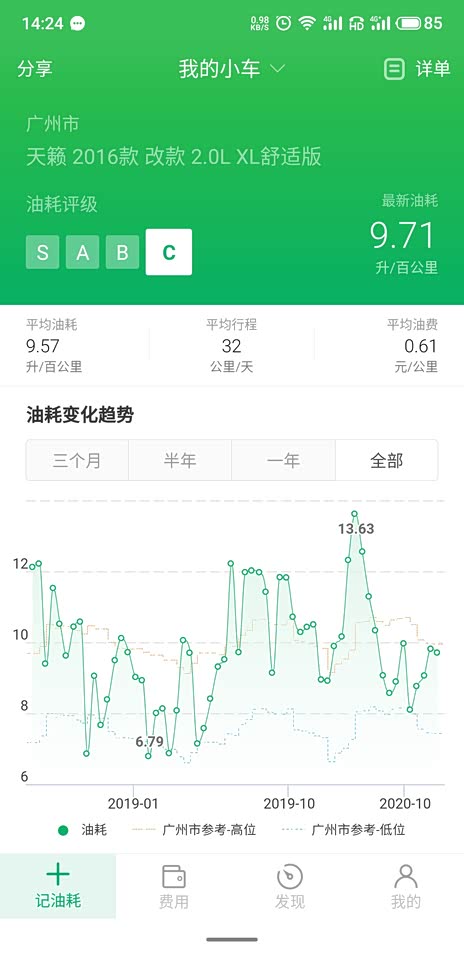 油耗总体满意,目前总体油耗9.7,是从提车到3万2公里的总体油耗,表显油耗与小熊油耗一样,很准确,这点值得表扬。 3万2公里其中80%是自己一个人开,估计有80是市区路段,而且本人开车经常是暴力开法,红绿灯起步是3k到4k转,有些情况下急加速是地板油,高速也是暴力穿插加频繁加油刹车。所以这个油耗我没什么好抱怨的。其他车友有看过市区7个多油的。