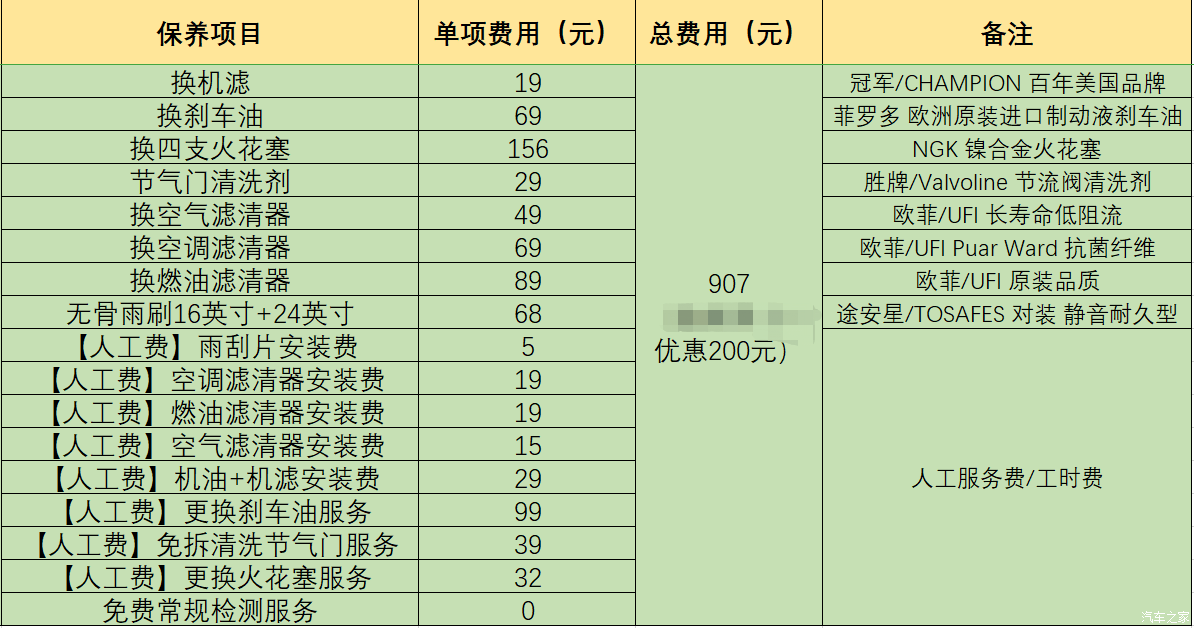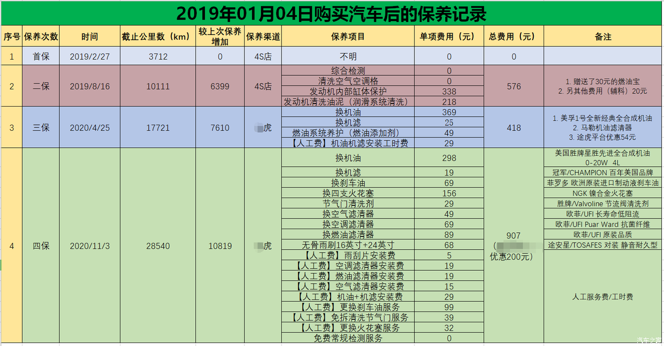 我有一个习惯,喜欢总结和思考。因此,每一次的保养我都有详细的记录,包括保养时间、里程、保养项目、费用等等。自己记录每一次的保养,好让自己心里有个底。免费保养就是首保,仅此一次,第二次去4S保养花了差不多六百,这就算了,关键是没有什么太大的作用,保养的项目非常少,花费还高。而且,4S店保养的项目都是他们自己定的,我没有选择的余地,具体保养了什么我一无所知,当然,他现场问我要保养什么我也不知道,因此后面我全部保养都是在某虎上面做的,自己对着保养手册一一研究,看多少里程、多少时间应该进行什么保养项目。4S店保养还有不好的一点,他们总喜欢强加一些东西,比如什么燃油宝之类的产品,说是送的,其实费用是算在保养里面的。自从放弃在4S保养以后,我就自己在APP上选择需要保养的项目,因此对每次的保养我都了然于胸,如用了什么品牌的机油,机油的参数是什么等等,包括每一个项目的工时费,这样保养下来一目了然。下面我就把我每一次的保养记录都截图下来,以作参考。【声明一下:表里面的所有保养项目都是我平时每一次保养的真实记录,不是临时做的,我也没那时间去搞这些虚假的。】