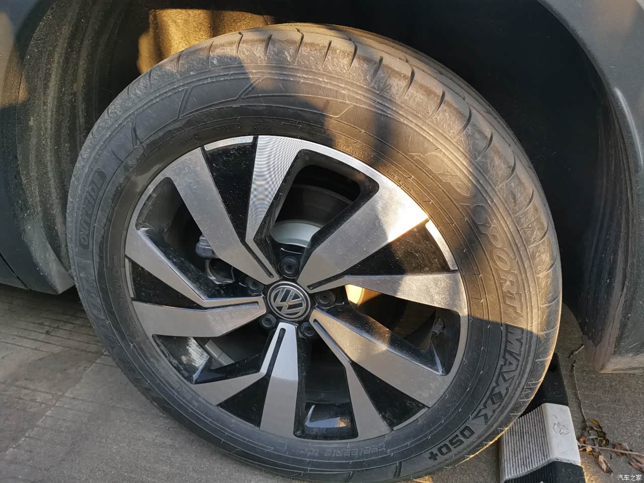 探岳车灯比较有个性吧,自动头灯和格栅连为一体,车下巴显示出一个X,雾灯上方是日间行车灯,行车灯为LED,样式为一字型。车轮是邓禄普的18存轮胎,比较硬。车身两侧有贯穿全身的线条,非常好看。车头也有流线型犀利线条。我的车漆是白色的,细看杂质颗粒几乎没有。