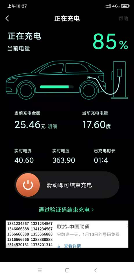 随车自带的充电器,环境温度5度,基本上一个小时能充20公里左右,用的是4平方的铜线接地,16A的插座。国家电网,剩余44%电量快充大概90分钟,基本上一分钟1%,但是,最后充得慢了。