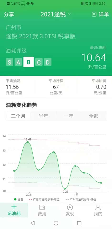 油耗逐级下降,现在是11.6升,估计以后会在11升以内。最低开过6.3升的油耗。