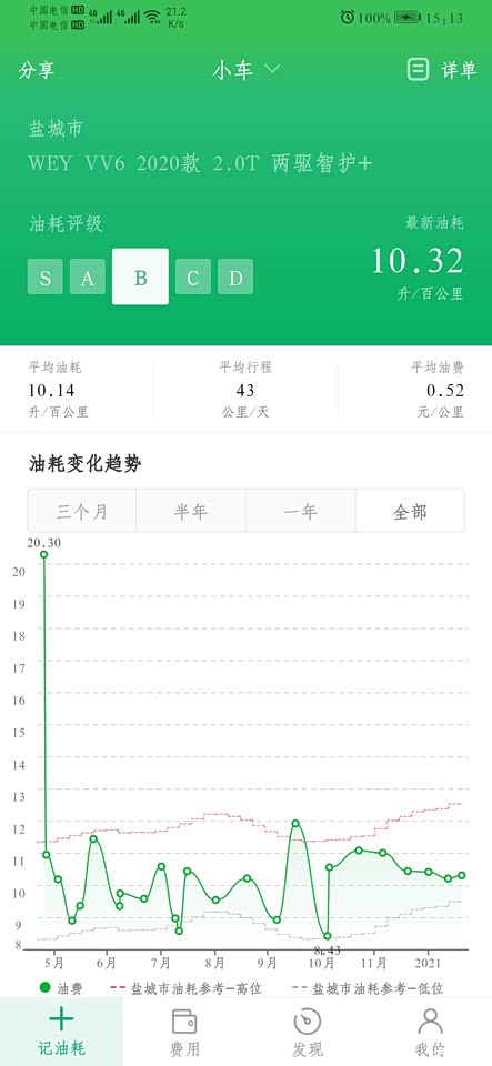 开了11000多公里了,一直用的小熊油耗记录的,市区加郊区平均油耗10.1,还算满意的了,