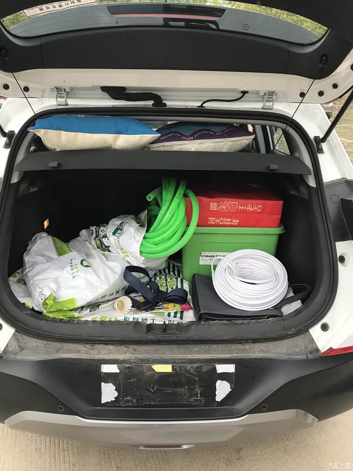 后备箱空间也还行,开口大,地板平,比预想的大很多。买车没多久,就有考验了,老爸要出去干活,拉工具,就用上它了,家里的轿车后备箱开口小,不好装。