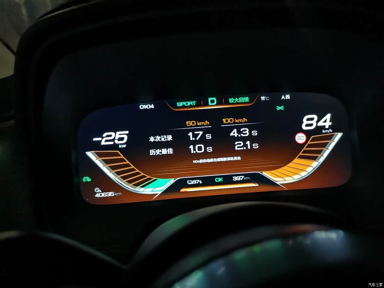 没有专业仪器,用车上自带“欢乐表”测的,最快4.27 破百 动力我着重说一下,冬天动力限制非常厉害,车里一人测过5秒多。还有电量对动力的影响也很大,80%以上基本可以全功率,60%——80%就会限制一些,尤其是90以后的加速,会很无力,电量60%一下的后段很无力,80码以后加速毫无推背感。所以要玩的话最好先充满电。 测加速时温度很低好像在0下,到大不了最佳工作温度,并且电量也少,限制功率了,随后又测了一次4.27没录像 附上车友唐的究极加速2.1秒😅