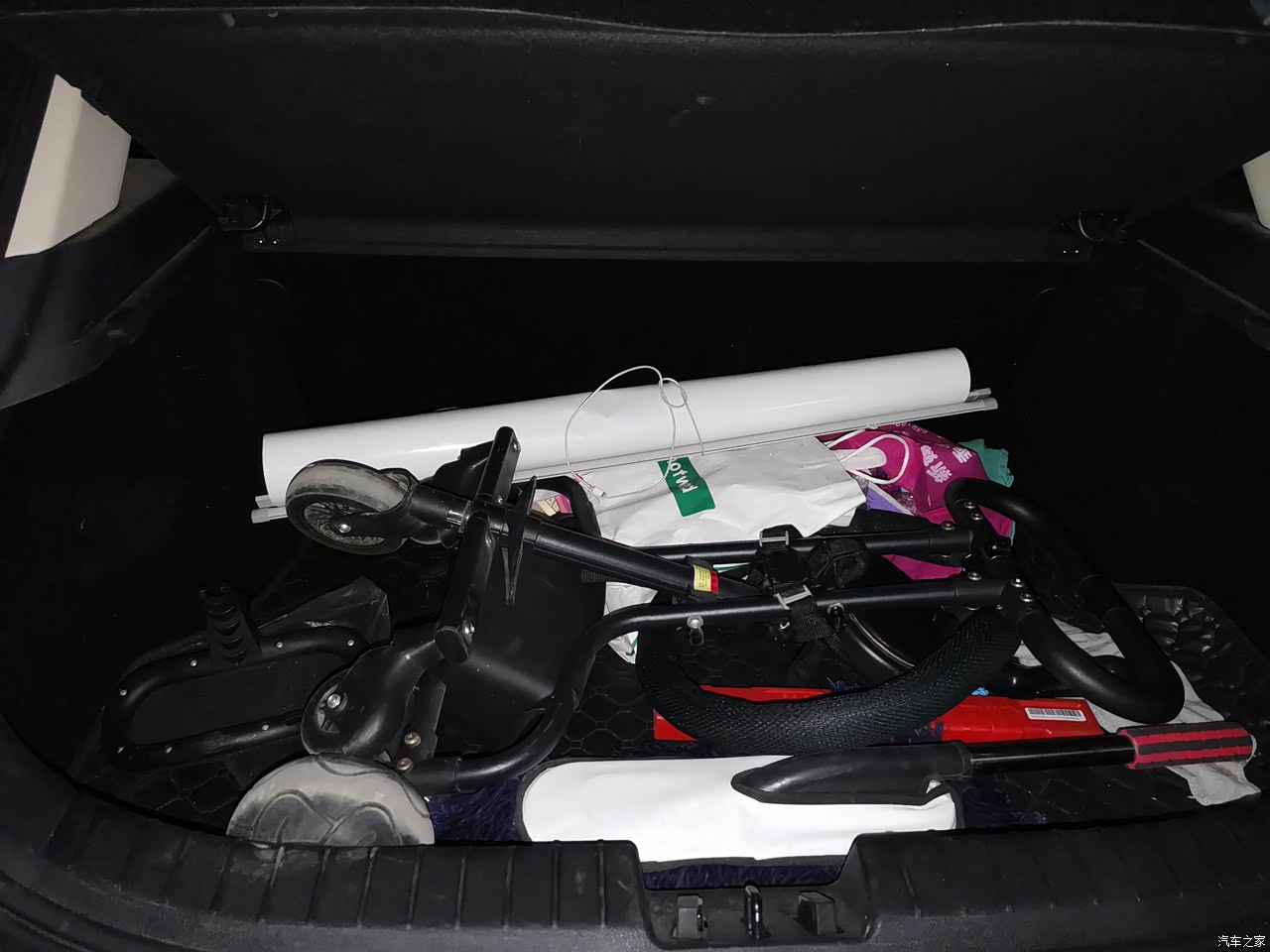 后备箱放小孩的车子外加一个不大不小的箱子没有问题,结构设计也很合理。