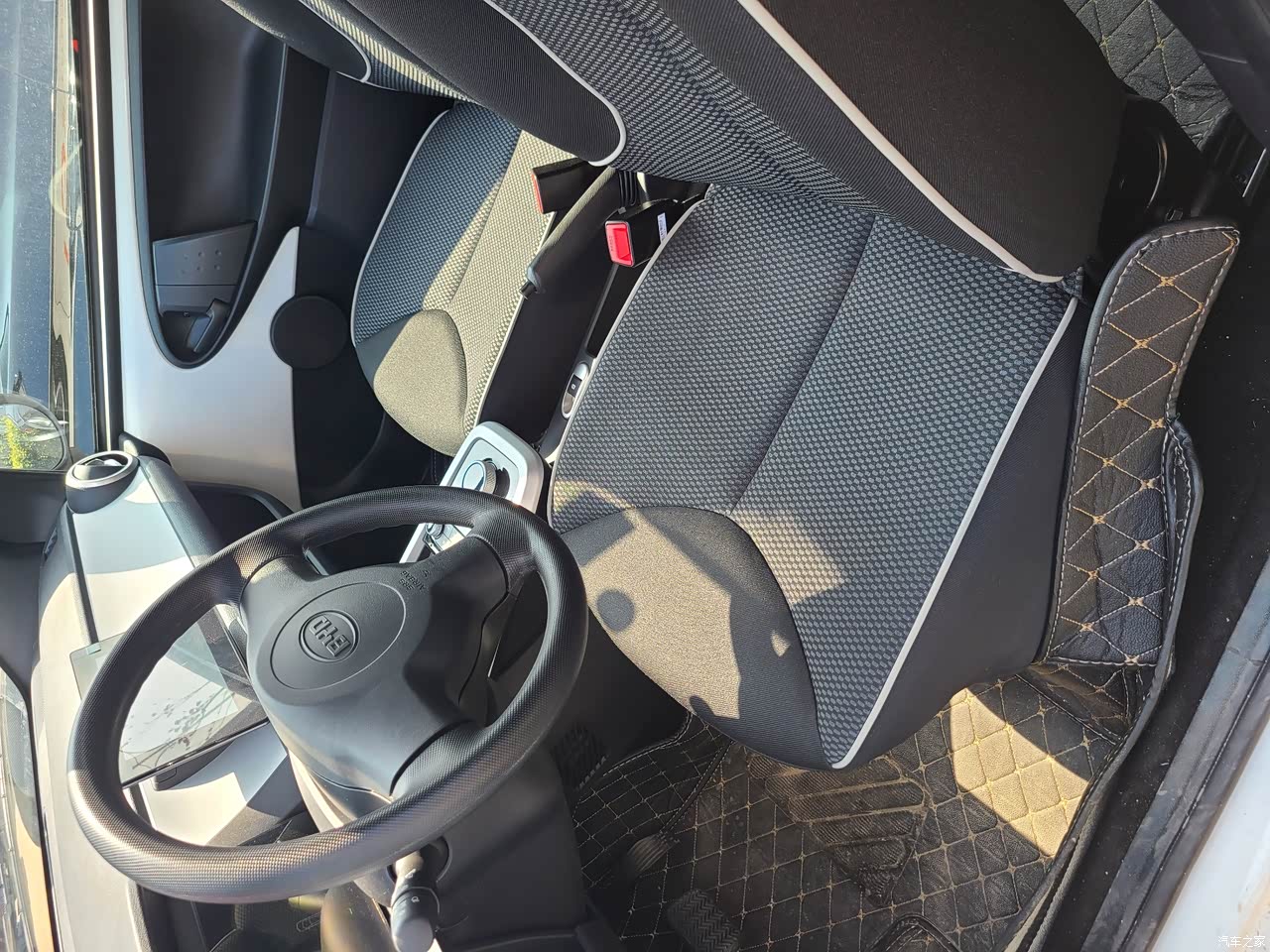 内饰比较简陋,方向盘塑料感,座椅是布料座椅,但6万块钱的车哪有皮料给你配,一分价钱一分货。