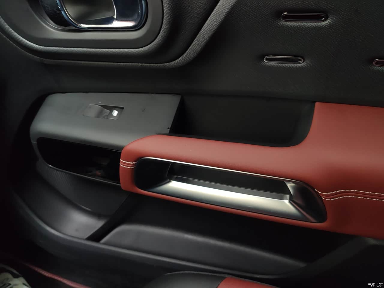 内饰用料稍微差点意思,软性包裹的区域不多,车内棕色覆盖的区域都是皮质的,门框这里是搪塑材质的软性包裹。仪表台上还有很多触碰到的地方为硬质材料。