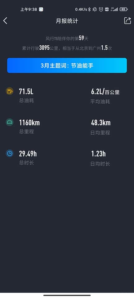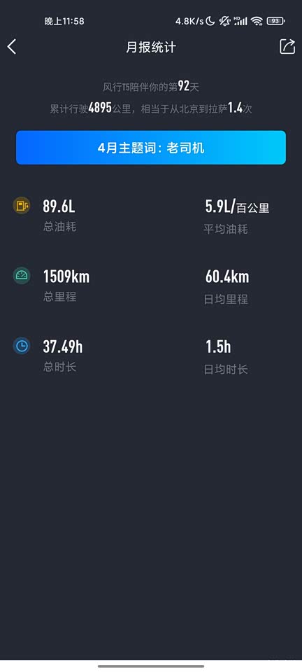 这车还是跑70-90之间最省油,这是四月的,车机这里app的记录。可以说我非常满意了。先说一下,我这跑外环上下班的,平均车速都能80左右。