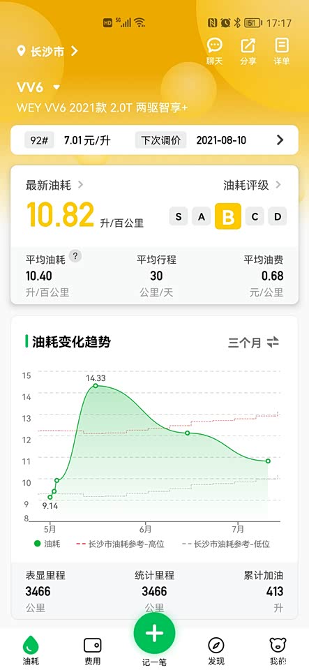 市区内差不多11个左右,高速9个左右,综合下来10.4