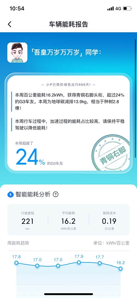 这个我感觉和个人用车习惯有很大的关系,我个人开车比较随性,所以能耗是相对较高的,这个不做参考。作为电动车冬季续航多多少少都会有折扣,不过g3的表现还是不错的,在可接受范围以内,不会很夸张。这个还是值得肯定的。