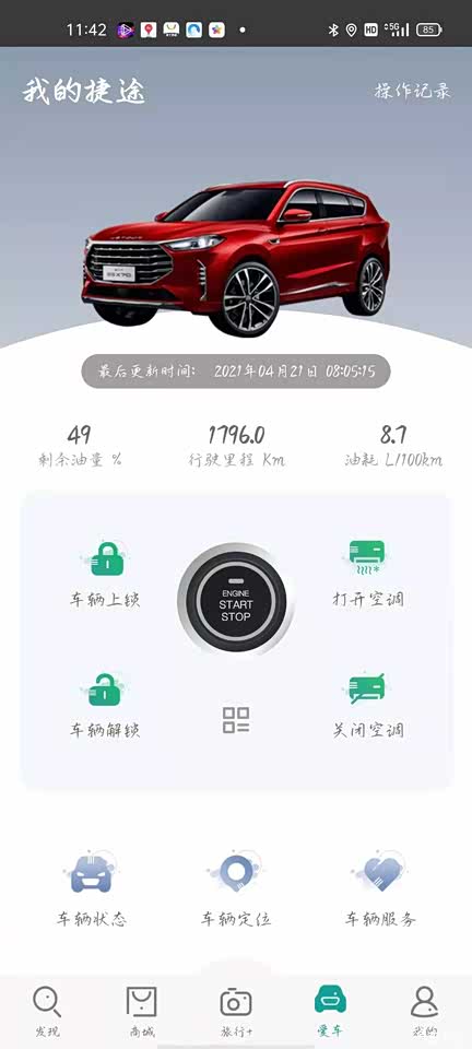 目前行驶的里程数和油耗,APP里功能很齐全,远程启动,空调开关,车窗开关,灯光开关,寻车,天窗控治。