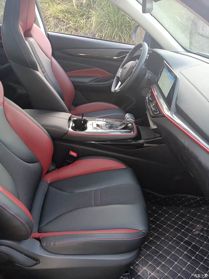 这款车的内饰挺不错的,红黑搭配,显得这款车非常的运动时尚,座椅是比较独特的,织物和皮质混搭的红黑风格,坐上去的感觉挺舒服的,而且支撑包裹性厚实,是真皮的软性材质,多功能的方向盘,中控屏的360度的全景影像,行车记录仪,倒车影像都有,这也够日常开车使用了