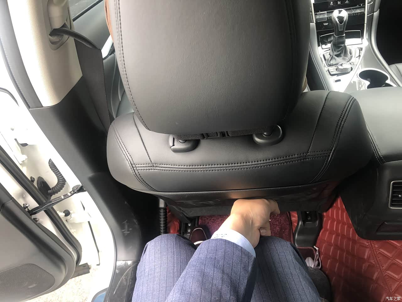 180的身高,喜欢座椅躺下开车,驾驶座椅已调到B柱后,这个姿势下,后排腿部空间正好一拳,后排储物能力一般,座椅中间有一个杯架,可放2瓶水,后排门板上无储物空间
