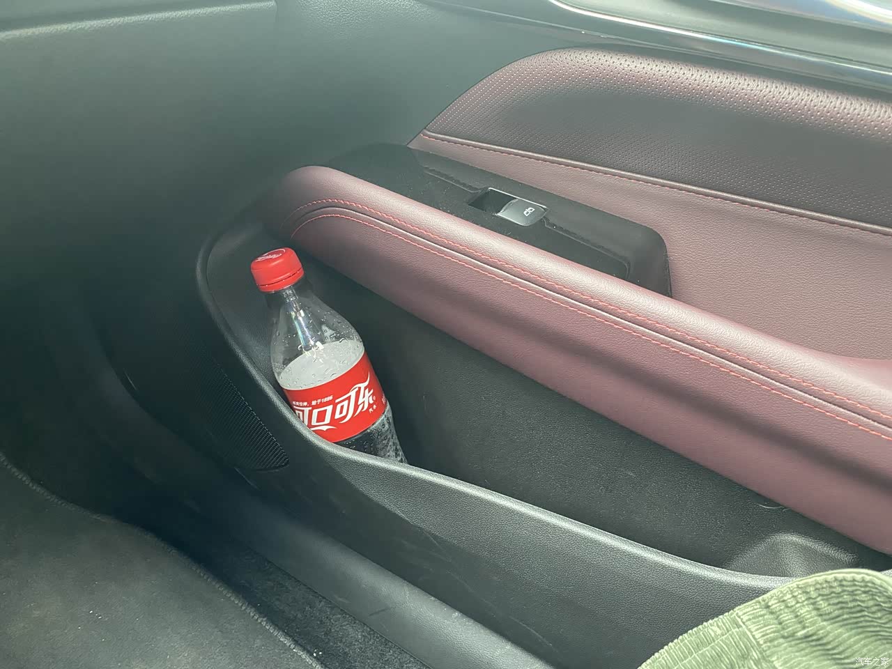 这个门板储物格很大,放两瓶饮料没有问题。上面还可以放手机