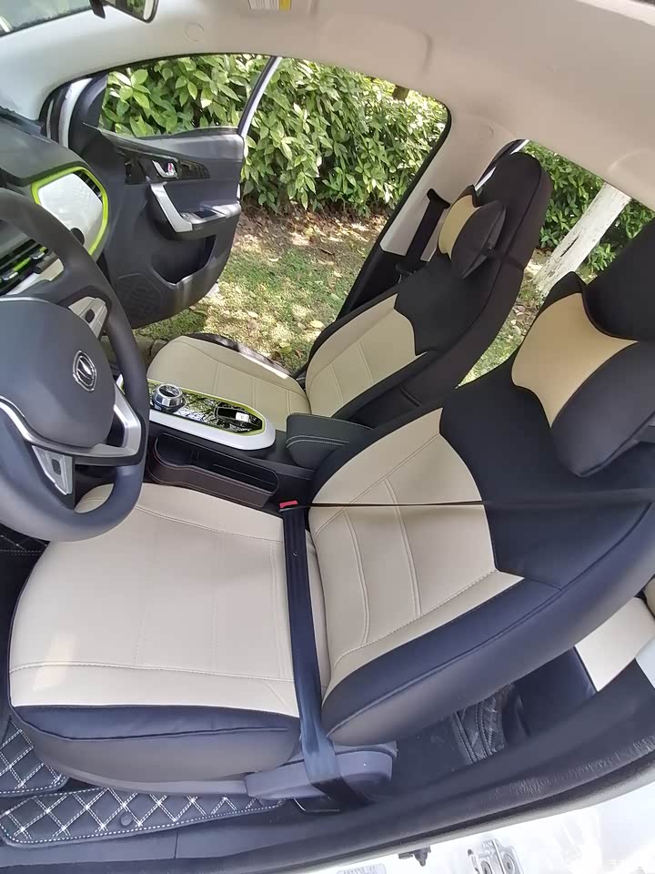 比起原来的油车,这个车子太安静了。为防止低速行驶提醒路人还模拟出电机啸叫声来,也是想得周到了。车子座椅柔软贴合,一体式座椅虽然样子不受人待见,但是确实比较舒适,加个头枕,效果更好。由于车子本身没有发动机噪音,因此隔音效果还是不错的,路噪胎噪声音不大。