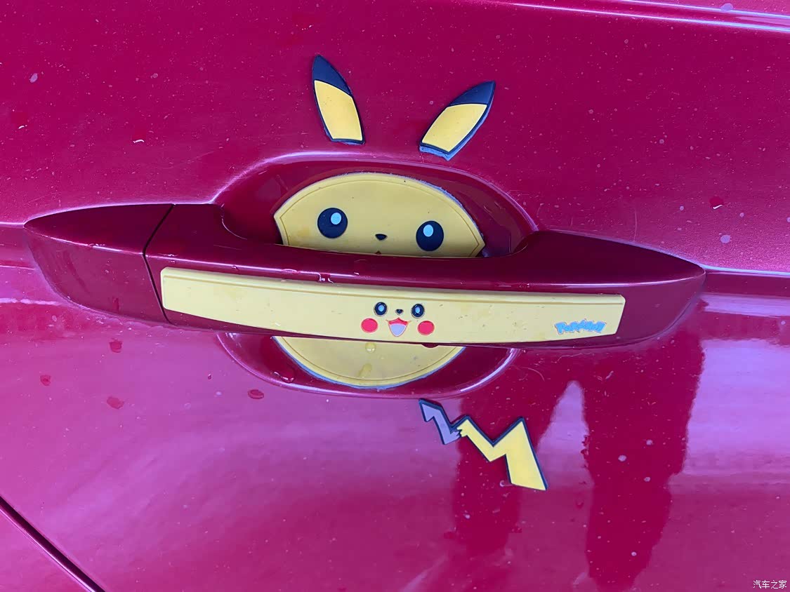 门把手的位置防止开门指甲划到车漆,贴了儿子喜欢的皮卡丘,起到了一定的保护作用,还挺好看的。