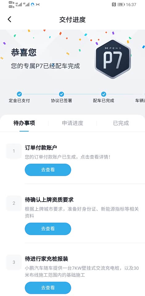选车是在清明假期到五一假期,一个月订车了。期间只考虑了比亚迪汉四驱旗舰(27.95W)和小鹏P7的超长续航智尊版(27.69W)。汉--空间大、配置高、动力强P7--车机系统好、科技感强、外观拉风、免费充电、续航里程长。汉,去过5家4S店;P7,去过5家4S店。最终选择P7,也是看中长续航、家门口有免费超充站(家里不让安充电桩,汉不太方便了)、服务更好,孩子也很喜欢(其实孩子更喜欢汉,但无奈销售不给力啊)。