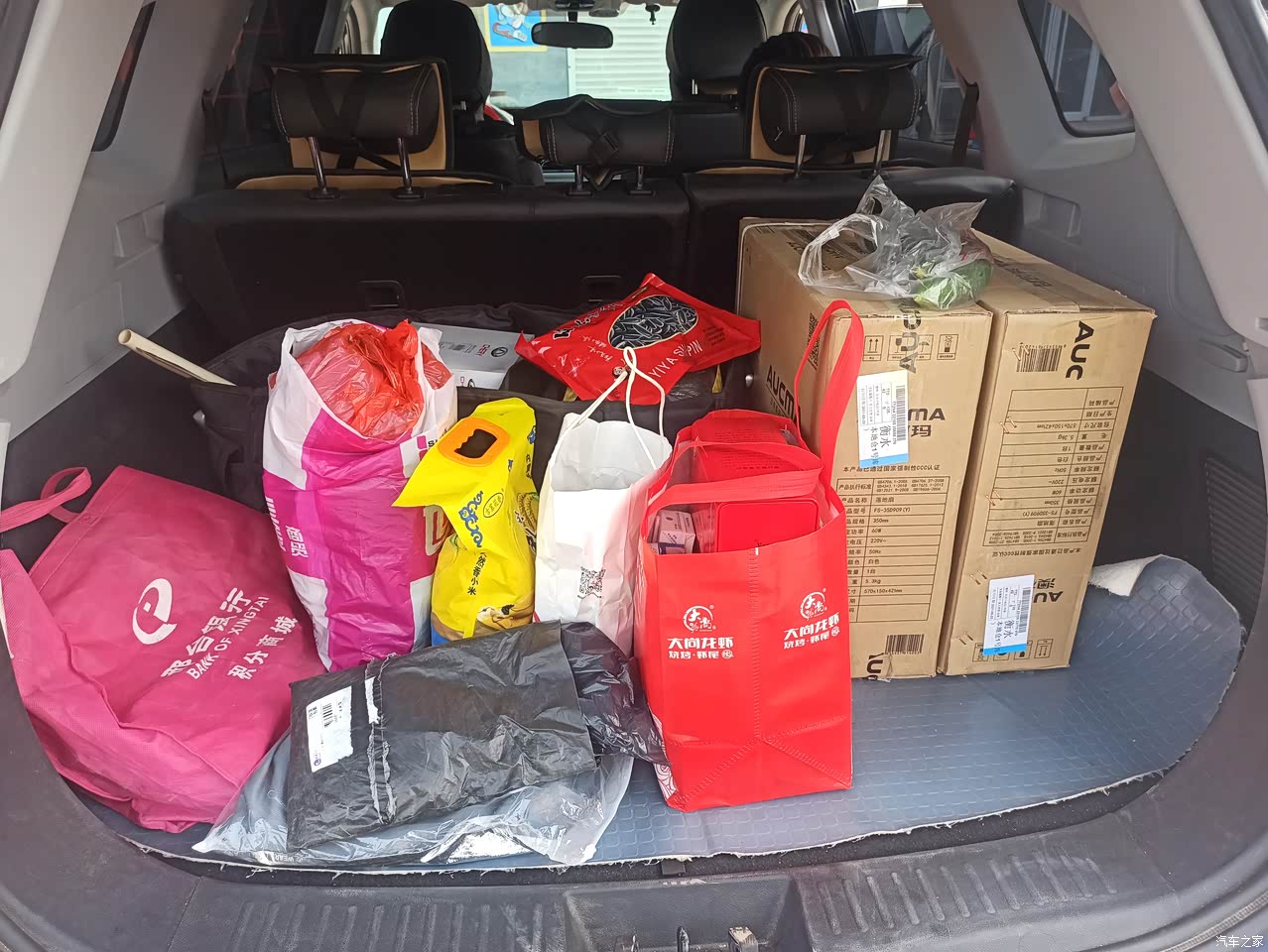 后备箱空间看一下,两个电扇,还有一个整理箱,等等很多杂物,还有这么大的空间。