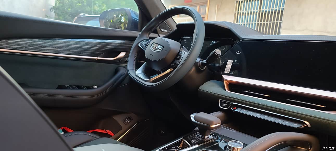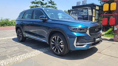 超大杯的车身尺寸,4.77米的车长,前脸采用直瀑式的中网,中间是一个黑色的最新款的车标,很容易辨识是吉利汽车。,两边是三段式的矩阵大灯,而且是LED的,特别的明亮且寿命长。车身两边的镀铬两条,把车衬托的很大气。铝合金的前防撞梁,高强度钢占比79%,笼式车身,满足五星级碰撞标准,给驾乘人员最大极限的人身保护。