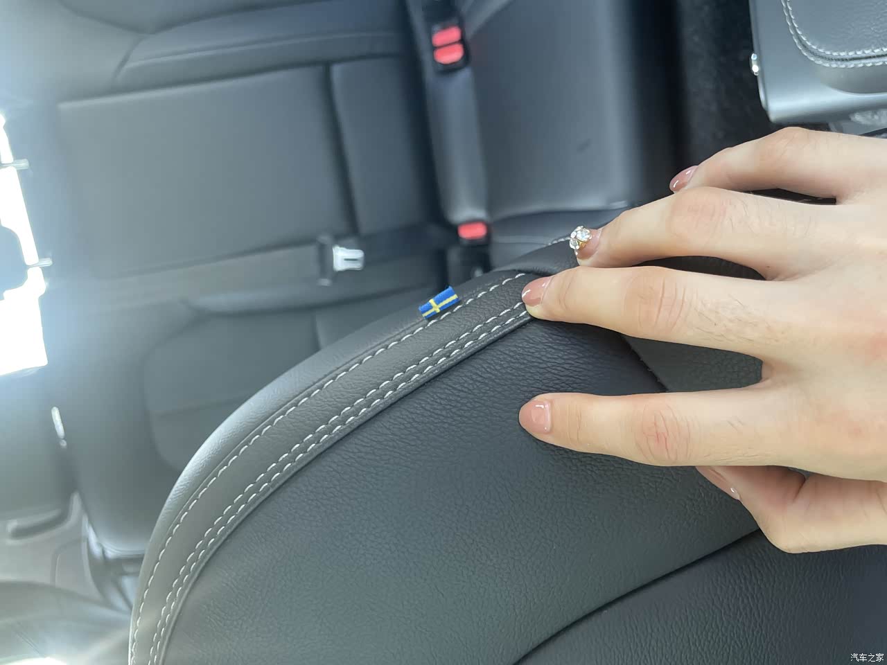 真皮座椅,新车也没有异味,这两天天气炎热,暴晒之后也没有闻到味道,空调也很给力,特别喜欢座椅上的瑞典小国旗,有点睛之笔(估计只有女人才会发现这种细节)。