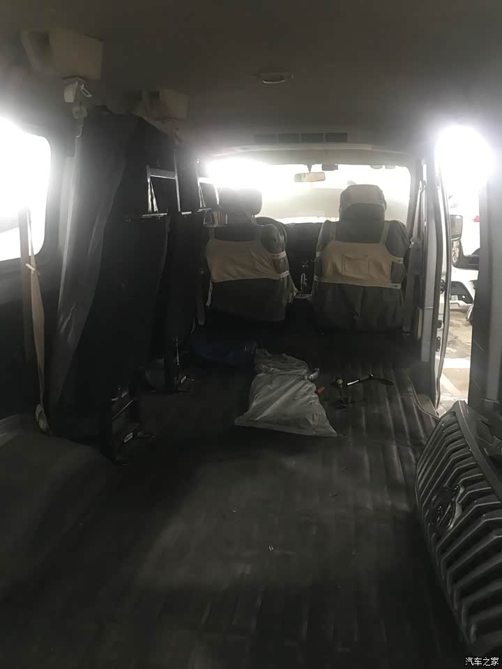 内饰做工材质比较一般,但是配置还是比较满意,空调助力,abs,大灯高度调节,电动门窗中控钥匙等等都还是有,还有个中央空调比较满意,人坐在后面很凉快。哦哦还有胎压报警这个配置还是可以,我们经常在外面跑,有时候胎压不足它会显示胎压报警灯提示驾驶员