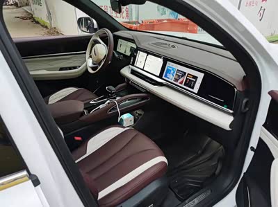 这内饰也只能夸了,白棕的内饰搭配,简洁高级。白色容易脏是痛点,不过还好的是,它的皮质擦拭一下就能去污。满满都是屏幕,都怀疑是不是进了飞机的驾驶舱😂,三屏还能联动,一个听歌,一个看导航,一个K歌看电影,都快成移动影院了。终生免费流量,语音交互系统,支持5G网络,很智能。