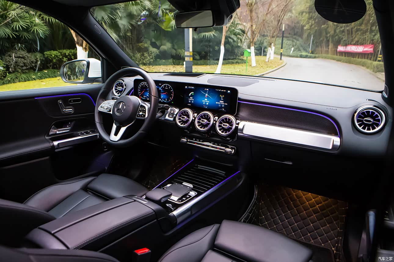 内饰可以说是同级别无敌了,买车的时候还去看了宝马x1和奥迪q3,内饰不知被glb甩了几条街,在店里看车,第一次做进车里就被这旋律的灯光迷惑了,空调风口里居然还可以亮灯,真是有点夜店既视感,大屏幕看着也是满满的高级感,显示效果很细腻,上车插上carplay导航很方便,刚买车时有个360全景也避免了不少小擦挂,这是小白必备配置。