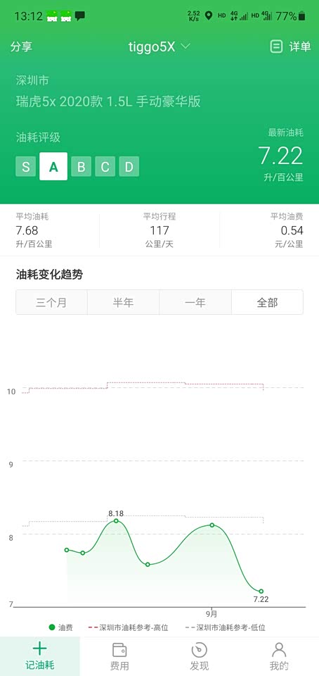 市区7.5左右吧,堵车就八个,高速应该6.5左右,反正一箱油跑六百公里是没问题的😃