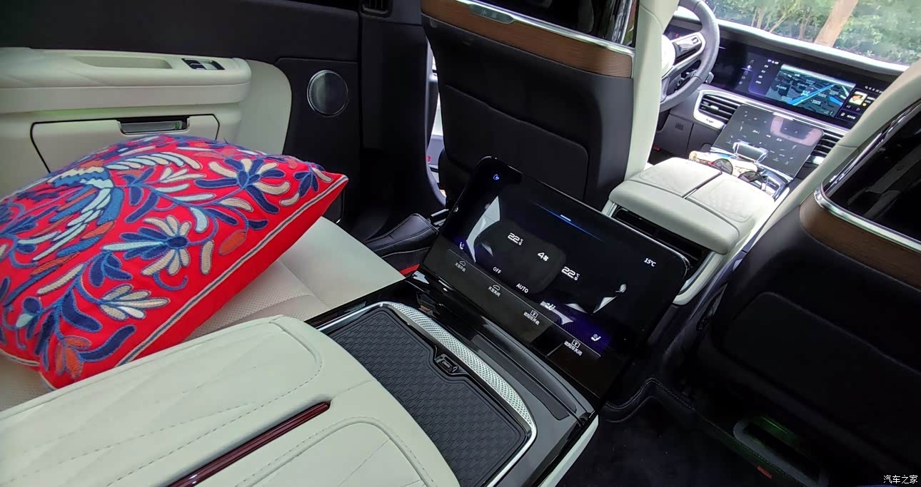 红旗E-HS9舒适性营造的超级好,航空头枕,伸缩腿托,座椅按摩,加热通风,全景天窗,后排独立控制区域,整个就一家庭沙发模式,加上车内的5块大屏,前后都能很完美的照顾到,非常适合家用及商务接待。
