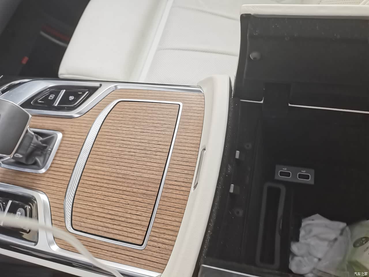 内饰情况,这个版本的车后面是有无线快充的,但是前面没有,而且红旗感觉没有意识到手机的重要性,所以中间感觉没有一个适合放手机的地方