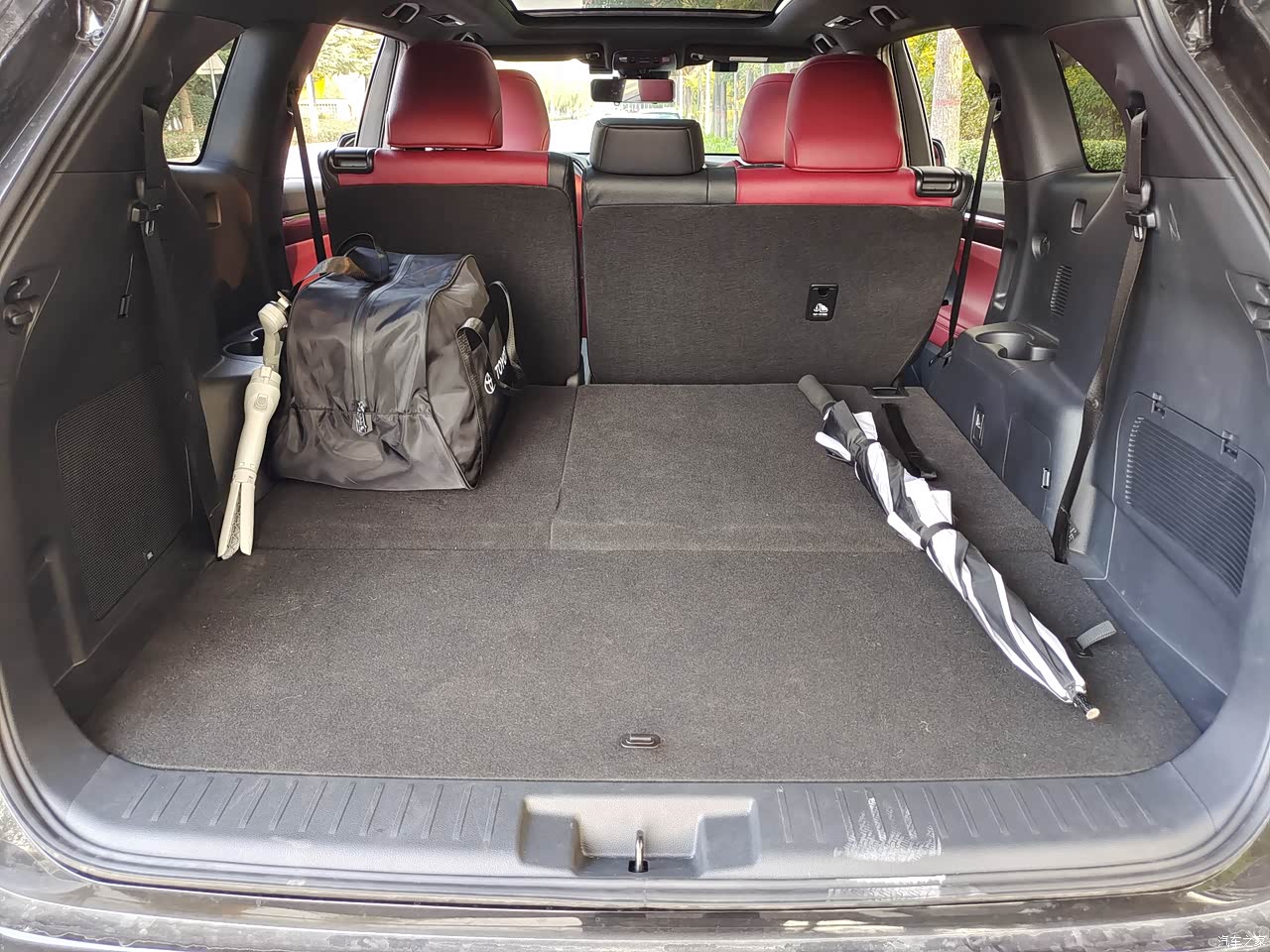第三排座椅放倒,后备箱空间还是蛮大的,平时放个整理箱还能余下很大空间,应该放几个24寸的行李箱没点问题!