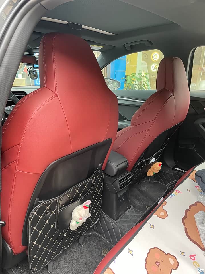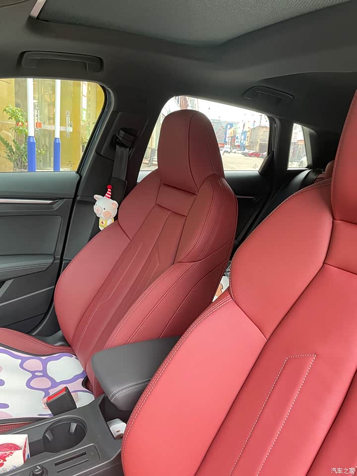 仪表盘和中控屏两块大屏幕再加上氛围灯在晚上看特别漂亮。还有跟911样的换挡小拨片,多媒体控制按钮。不过仔细看的话A3的内饰用料也就那样,硬塑料比较多,但用设计和不同材质的搭配很好地掩盖了廉价感。最重要的是中配的座椅是布皮拼接的,纪念款是红色全皮座椅,一眼便爱上了,而且朋友家人都在夸红色座椅好看,又高级!其他的多了无钥匙进入,副驾驶座椅电动调节(中配只能主驾驶电动调节),单色氛围灯,升级为顶配的花瓣轮毂,外加黑顶,还有一个价值200块的网格(主副驾驶位后面有个网兜,我反而想拆了他,败笔)所以感觉多了1w还是蛮划算的。而且听说全国只有1000辆,A3和A3L各500辆,每家店配额各1辆,我去提车那天,A3l前脚就被提走了。比较可惜的是没有氛围灯和电折耳,所以提车后我就去加装了。