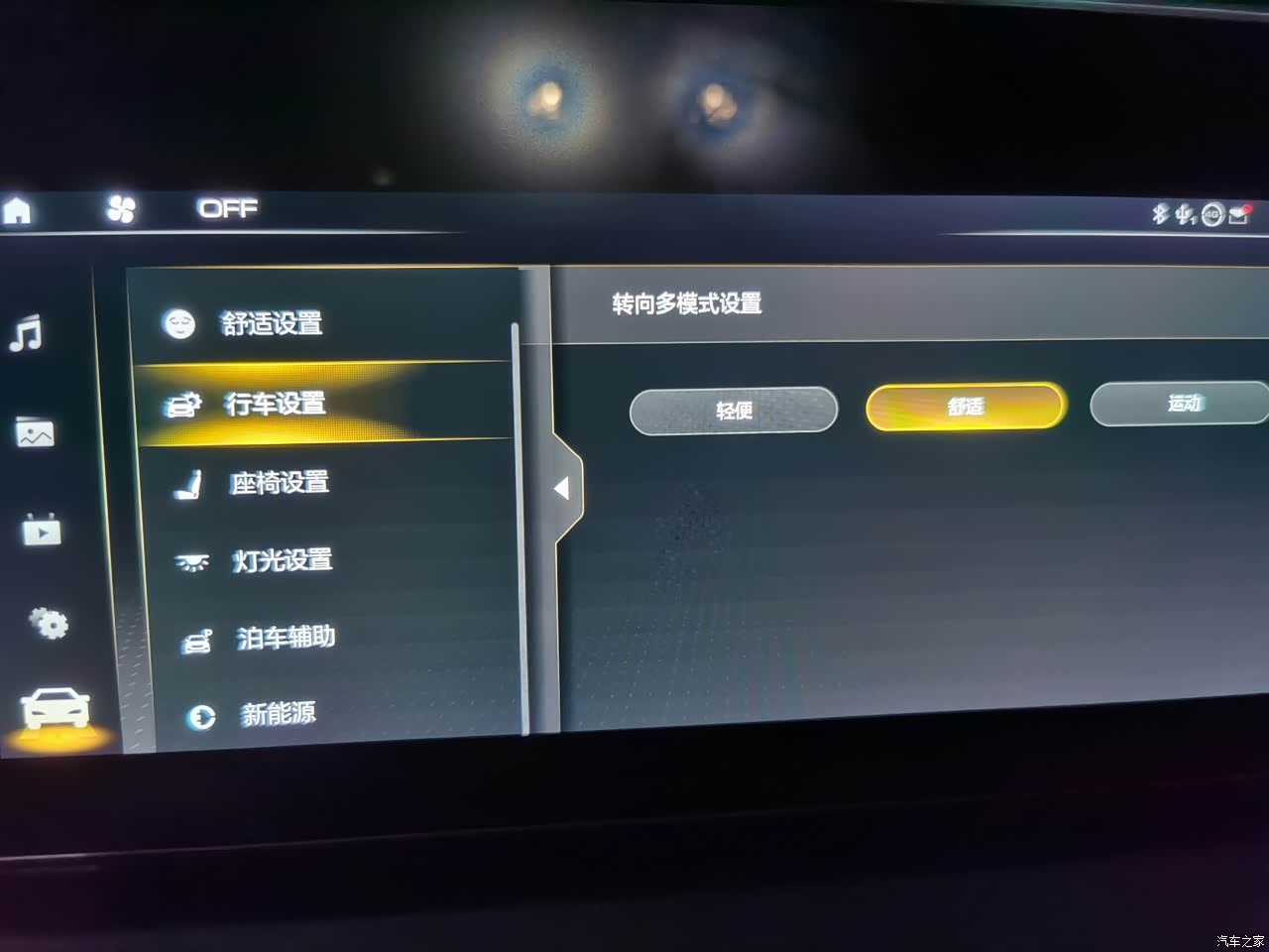 方向盘转向,在行车设置里,多模式设置,可以调节轻便、舒适、运动三种模式。这三种模式分别是方向盘的转向助力。