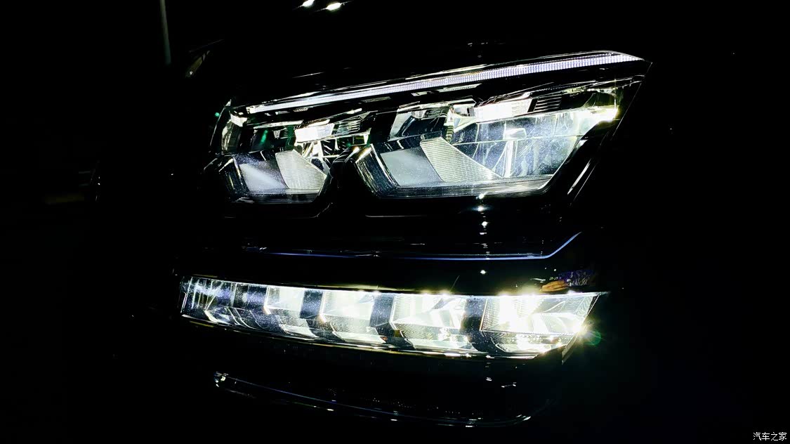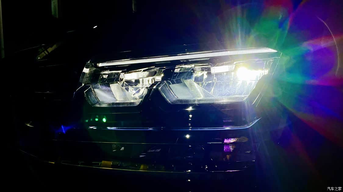 大灯还是蛮酷的,在黑夜中也给予了充足的照明信心,图中上为近光灯,下面矩阵式为远光灯,分体式设计,互不干扰。 行车转向时,也会根据方向启动辅助照明,扩大视野范围。