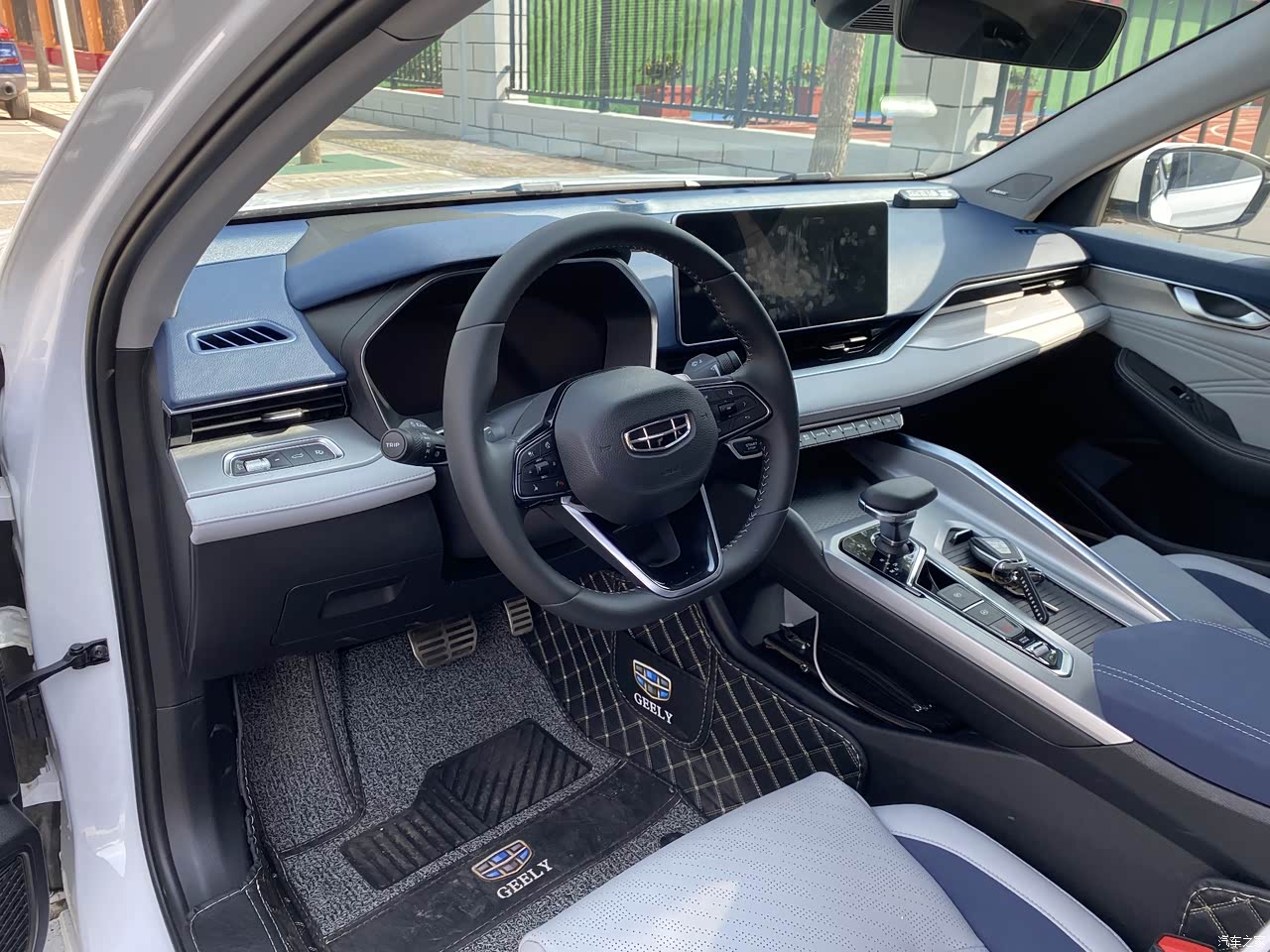 内饰颜色是蓝白色的搭配,视觉的色彩感丰富,全液晶仪表盘,悬空的大尺寸中控屏,全景的大天窗,皮实的座椅等等,能够感受到它做工的精细,以及用料的实在。