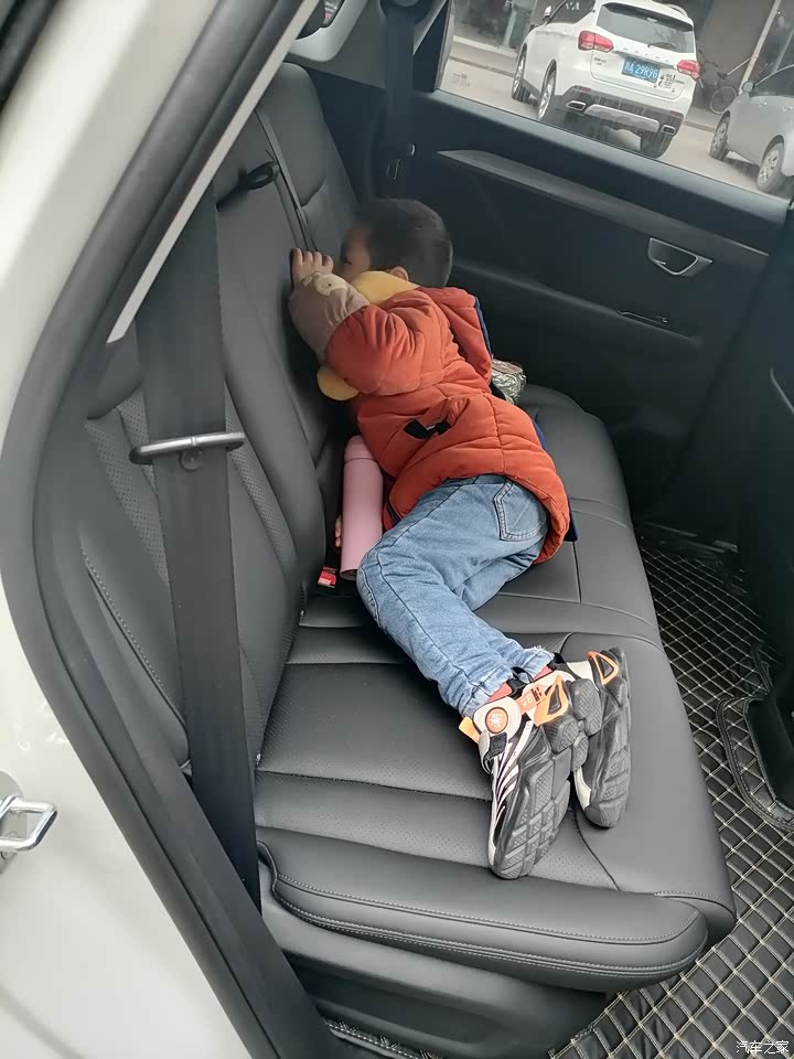 空间那是相当的大,我的身高一米七五,体重130斤,就我的体格坐主驾开车的时候还需要把座椅往前面调一点点,副驾的空间更大,可以坐个200来斤的胖子。后排空间也还不错,坐三个成年人都不会很拥挤,空间我是满意的。(配图我家娃娃在后排可以自由活动)