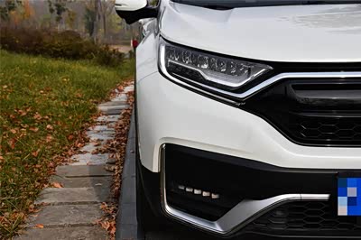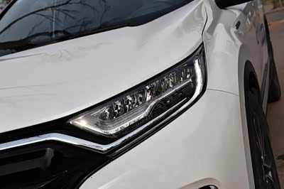 CR-V的外观还是很大气的,前脸看起来炯炯有神,两个闪亮的LED前大灯,经过银色饰条的装饰,好像人的一双大眼睛画了银色的眼线,看起来很有精神,下方两个蜂窝状梯形进气格栅平行排列,给人一种沉稳大气的既视感,前脸底部的两个点阵式雾灯,经过镀铬饰条的装饰,显得很有神采,车头再搭配上两个大后视镜,从前面看起来的CR-V还是很霸气的。