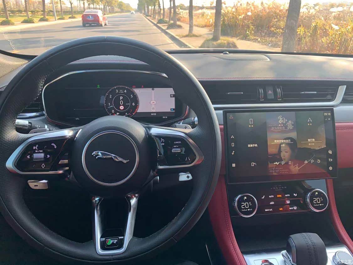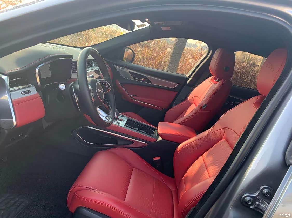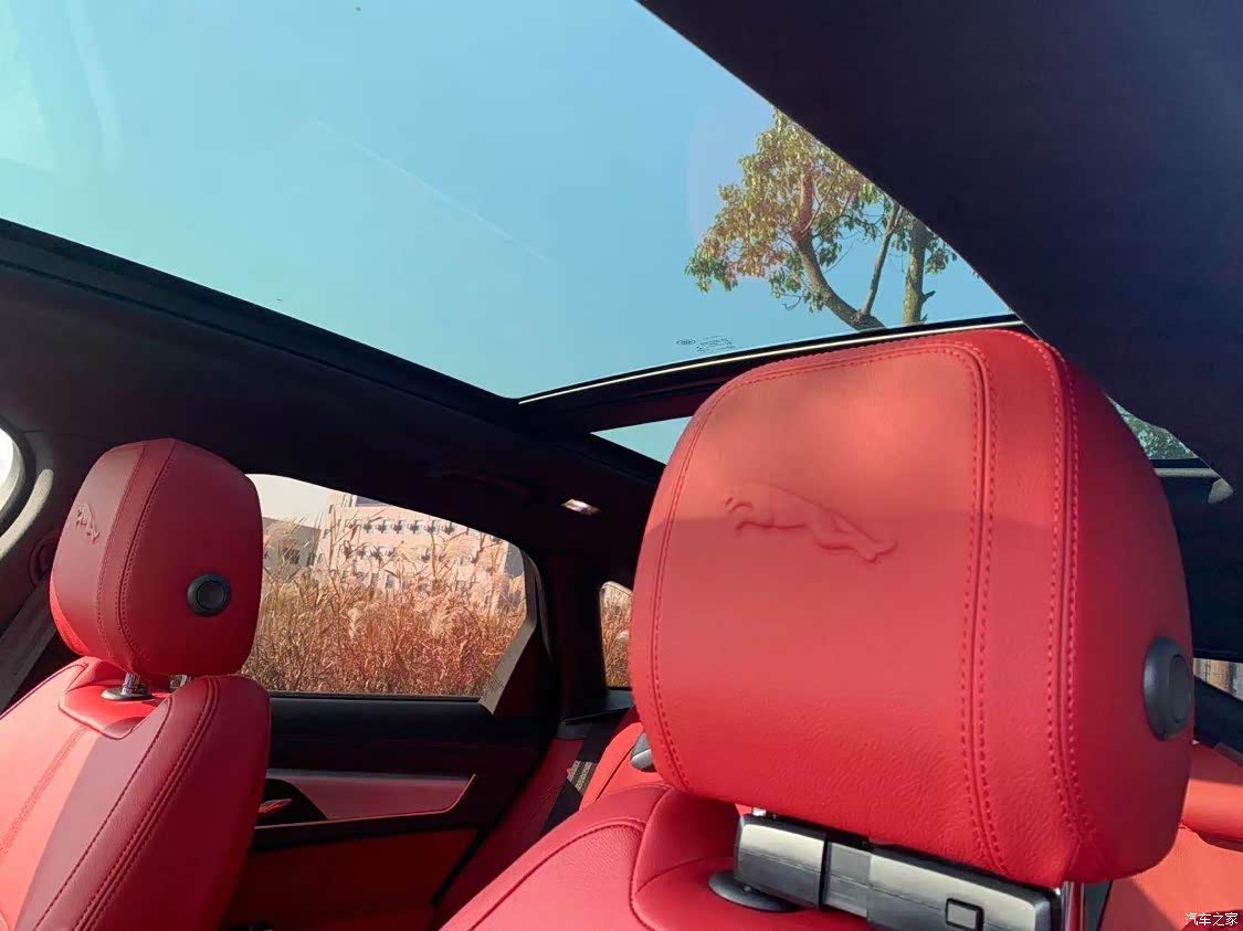 我选择的是红色内饰,运动风格满满,非常适合年轻人,里面细节也做的很到位,头枕的捷豹豹子的烙印非常有质感,中控11.4寸的曲面大屏很有科技感可以显示3D的全景影像实用且逼格满满。