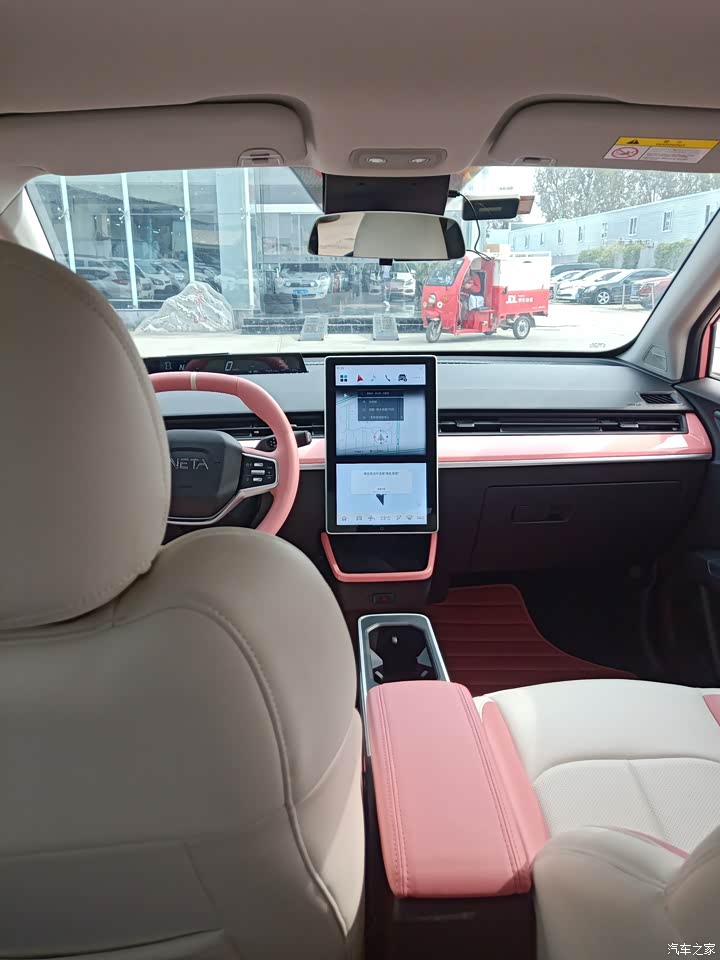 内饰也是粉色的,很喜欢,全车,粉色材料装饰,很有质感,舒适感十足,哪吒V超大的屏幕,很清晰,功能也很多,每个月都有流量,导航,听歌,啥的,都很舒服