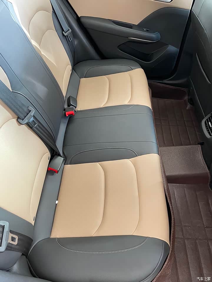 后排座椅空间还算可以整体来说舒适度是比较高的,座椅的材质也是皮质的打理起来也挺方便,没有装座椅垫子,感觉放了做地儿不整齐,这样看着也挺好。他这个后排有个空调出风口挺好的。