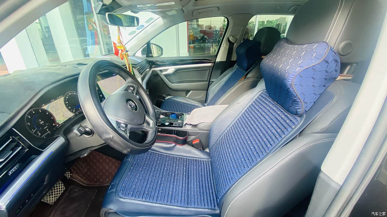 科技感很强,中控大屏,尤其蓝色的氛围灯一开,科技感满满。全景天窗很喜欢,虽然脏了很明显,但透光性好,一点也不觉得压抑。真皮座椅手感很好。
